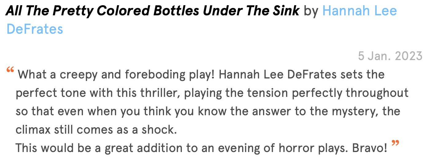 Likewise, Hannah Lee-DeFrates is a writer whose work I’m only now discovering. “All The Pretty Colored Bottles Under the Sink” is a great place to start, especially if you like thrillers.