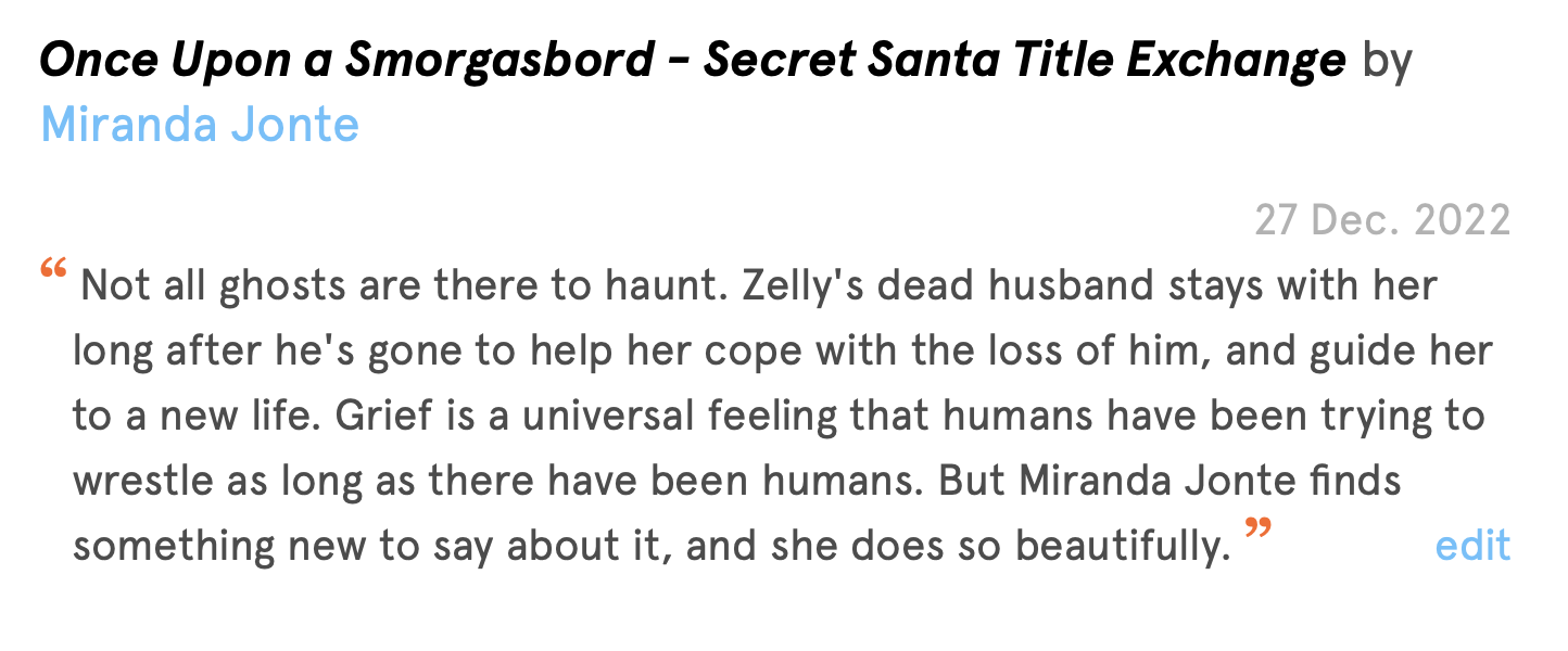 Miranda Jonte wrote a beautiful, poetic piece about grief and longing. It’s called “Once Upon a Smorgasbord,” and you should read it. If you’re a theater company, you should produce it.