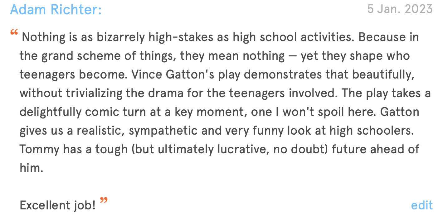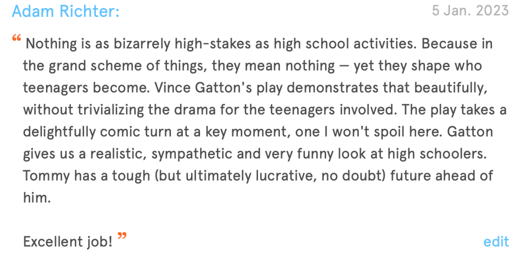 Vince Gatton’s plays can be found on New Play Exchange, and his website is at this link. I recently read, and recommend, his short play “In the Whole History of Hi-Q.”
