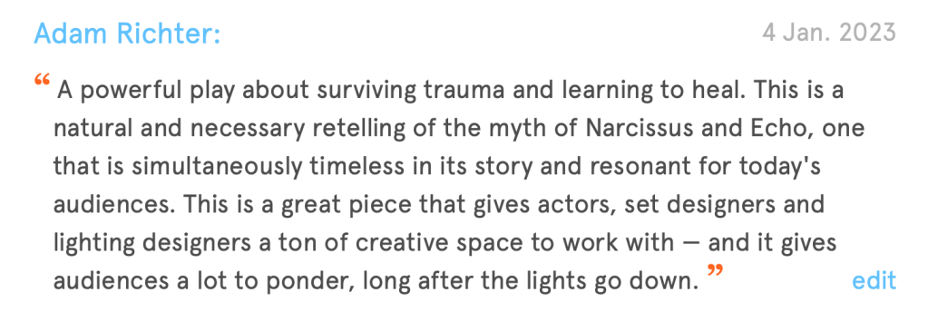 Thanks to Aly Kantor and Monica Cross for their kind recommendations of my new science-fiction play, “Hard Deadline.”