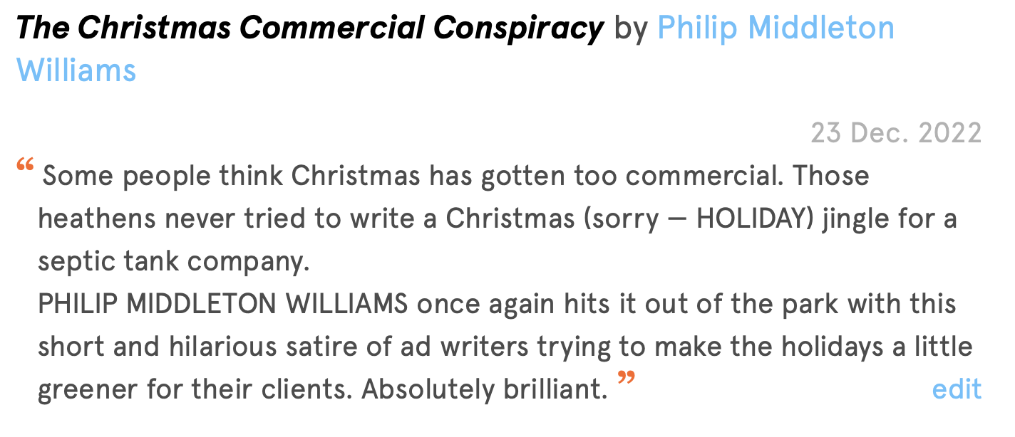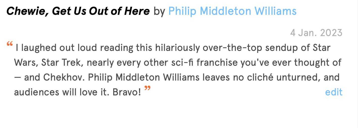 Philip Middleton Williams is a prolific playwright whose work I’ve admired for a long time. His works can be found on his website and at his New Play Exchange page. Check out “The Christmas Commercial Conspiracy” or, if you are in the mood for skewering science fiction sacred cows, read “Chewie, Get Us Out Of Here.”