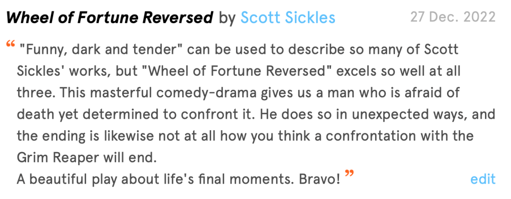 Scott Sickles seems to write a play a day, and they’re all brilliant. I recommend his short “Wheel of Fortune Reversed,” which you can find on his NPX page.