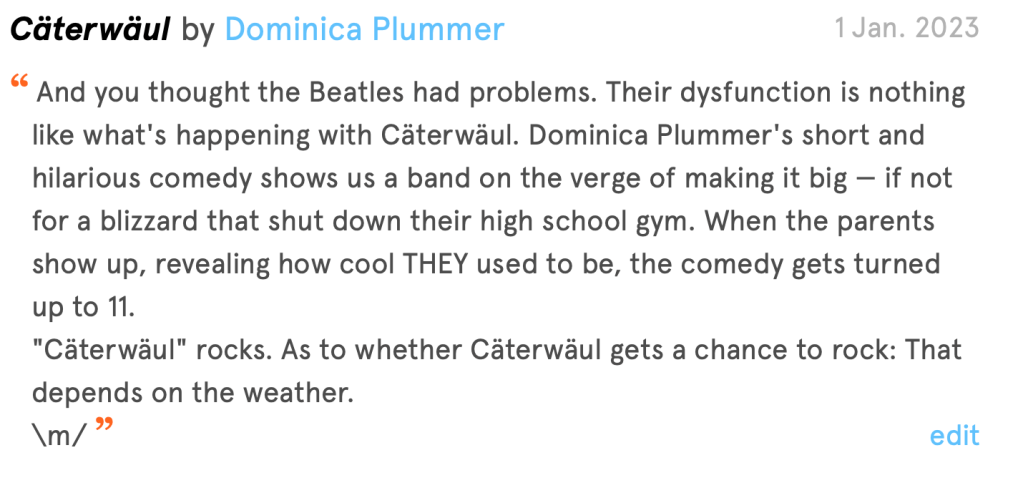 Dominica Plummer is a brilliant playwright and theater critic. Check out “Cäterwäul,” a terrific comedy about high-school bands.