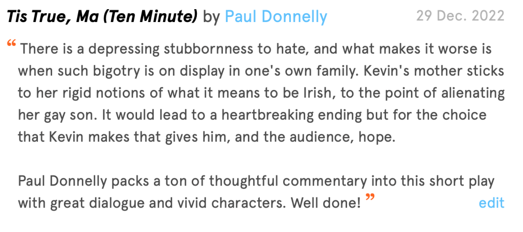 Paul Donnelly‘s plays can be found on his NPX page. Check out “‘Tis True, Ma,” a short play about family and prejudice, two things that too often go together.