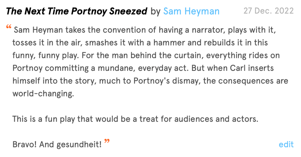 Sam Heyman has a long list of works on his NPX page. One recent addition that I recommend is “The Next Time Portnoy Sneezed,” a brilliant twist on the narrator trope.