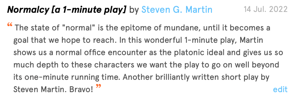 Steven G. Martin is an incredible playwright and master of the short form. If you can, check out “Normalcy,” a play so emotionally resonant you’ll be surprised to find it’s only one minute long.