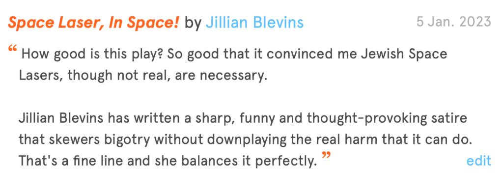 Jillian Blevins is a writer whose work I have only just begun to read, but her short play “Space Laser, In Space!” is one hell of an introduction.